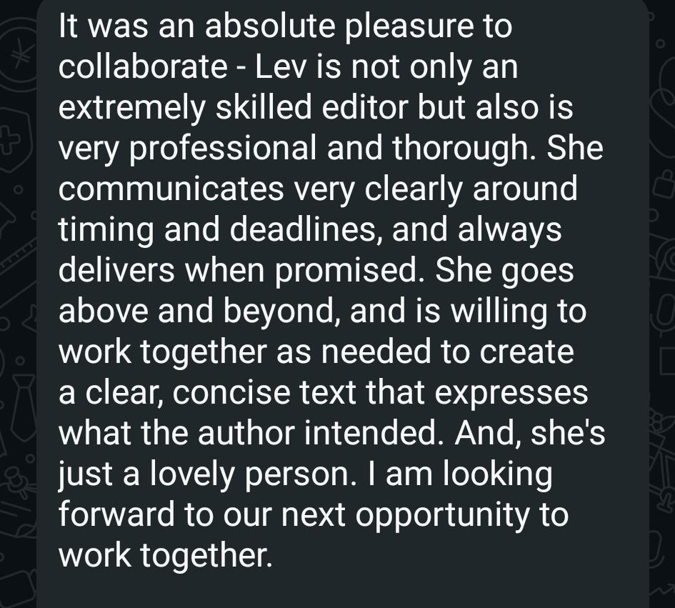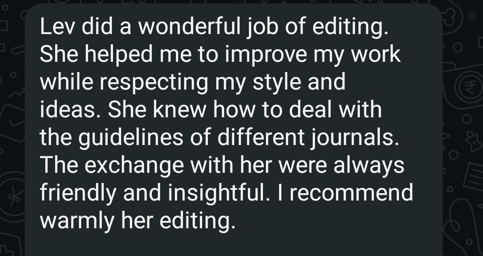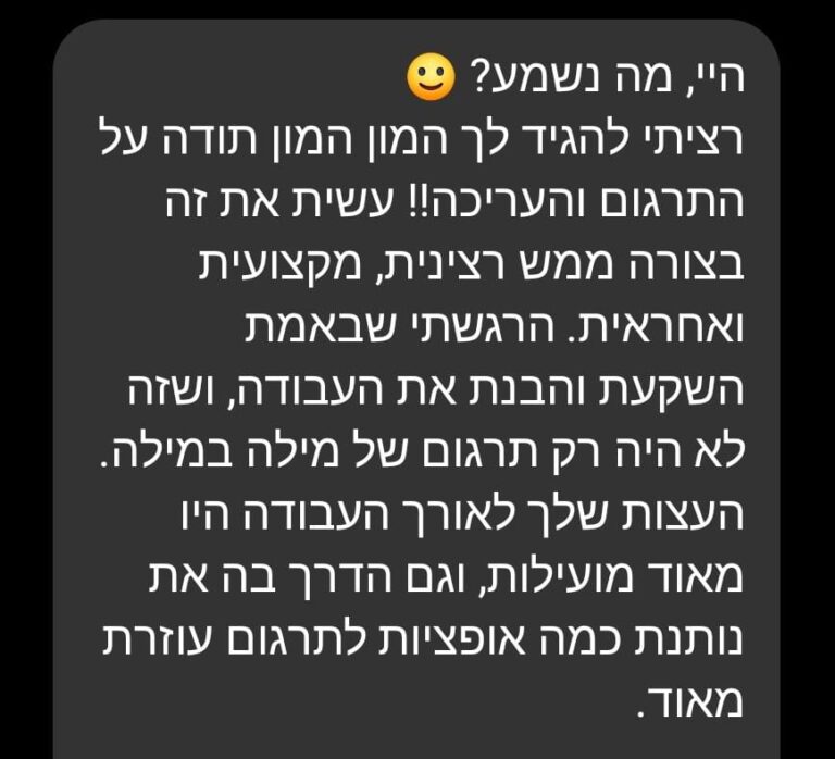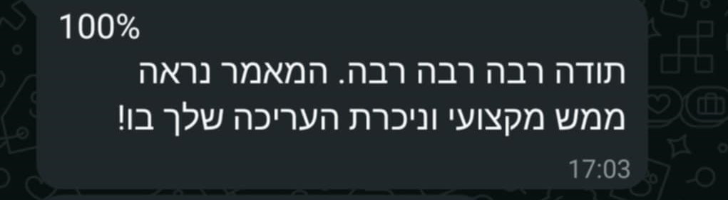 ·      עריכה יסודית, מדויקת, ואמפתית שמבטיחה רמת כתיבה גבוהה שעולה על הדרישות